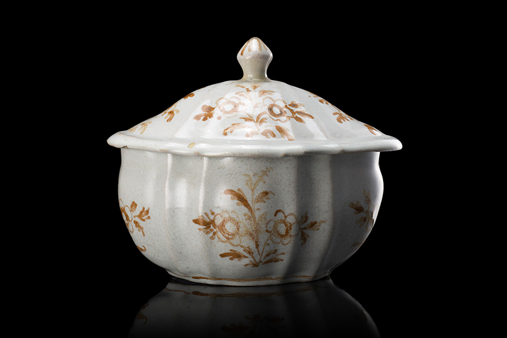 Zuccheriera costolata in maiolica con decorazione a fiori in monocromia...