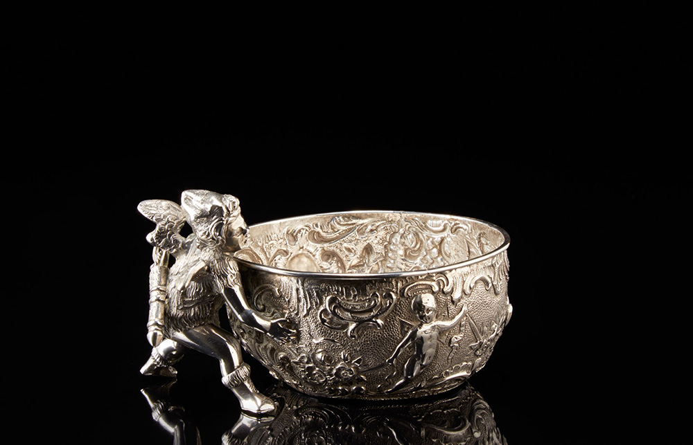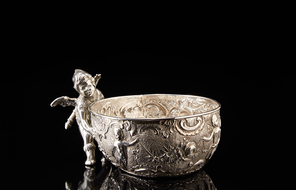 Ciotola in argento di forma circolare sbalzata a volute fogliate con presa in figura di putto alato a tutto tondo. Italia, sec. XX (d. cm 11) (gr 280 ca.) (difetti) 20th-century Italian silver bowl (defects)