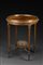 Tavolino tondo con piano lastronato in mogano a spina di pesce incorniciato...