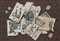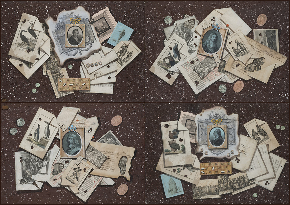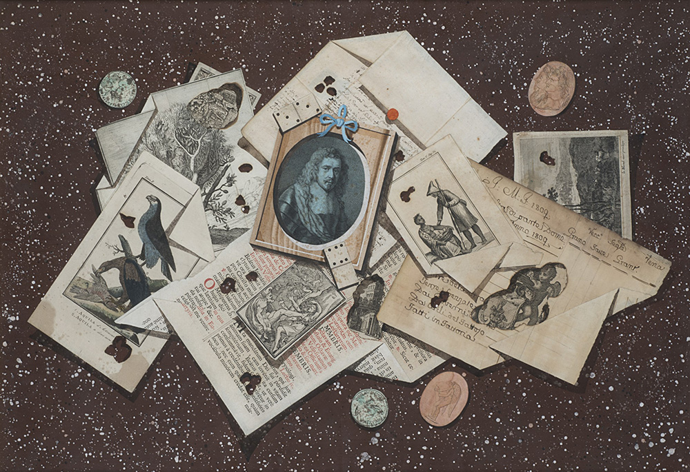 Gruppo di sei trompe líoeil a collage. Sec. XIX (cm 50x70) In cornici con profili dorati (difetti) Group of six 19th-century trompe líoeil collage on paper. Framed (defects)