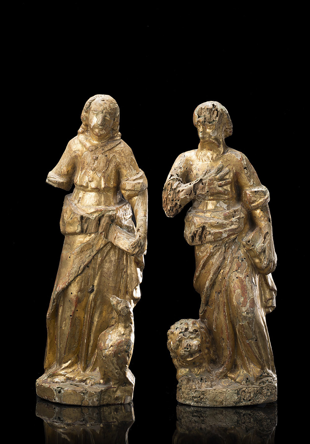 Scuola del sec. XVII "Evangelista Marco" ed "Evangelista Giovanni" due sculture in legno intagliato e dorato (h. cm 32) (difetti e mancanze) Provenienza: Nella Longari Antichit‡, etichetta cartacea 17th-century school, "Mark the Evangelist" and "John the Evangelist" two giltwood sculptures (defects and losses)