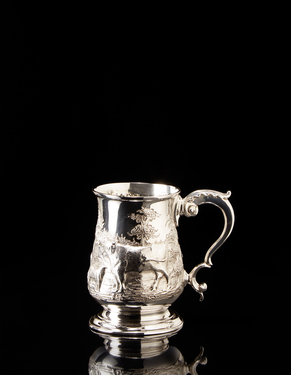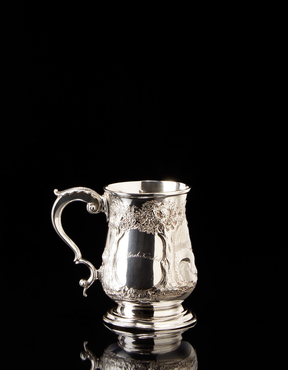Boccale in argento con corpo cilindrico sbalzato e cesellato con scene campestri, manico a voluta fogliata. Londra, 1789 (h. cm 13) (gr 380 ca.) (difetti) Silver mug. London, 1789 (defects)