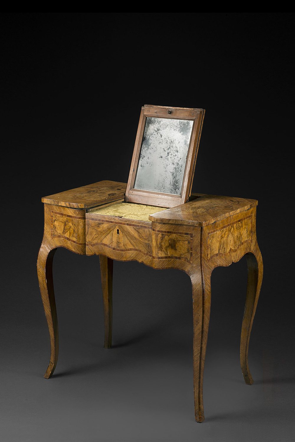 Tavolino toilette da centro lastronato e radicato in noce, filettato in bois...