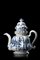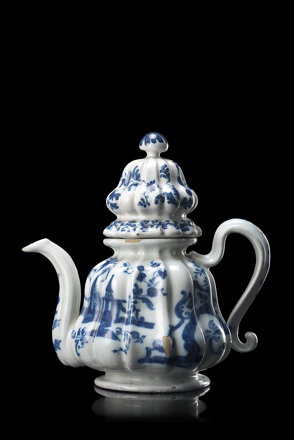 Teiera in maiolica con corpo piriforme costolato, lungo beccuccio e alto manico a voluta. Decorazione in monocromia azzurra a ëpaesini cinesií. Il coperchio cuspidato Ë assemblato (h. cm 19) Nove, Bassano, Antonibon, sec. XVIII (felature, sbeccature e cadute di smalto) Majolica teapot. Nove, Bassano, Antonibon manufactory, 18th century (restorations, chipping and losses)