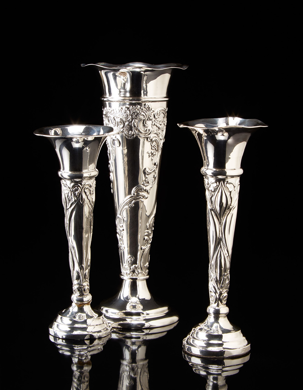 Lotto di tre vasi in argento di forma conica svasata decorati a motivi floreali e volute. Il pi˘ grande Londra, 1899; la coppia di pi˘ piccoli Sheffield, 1913 (gr lordi 500 ca.) (difetti) Lot comprising three silver vases. The biggest: London 1899; the other two: Sheffiled 1913 (defects)