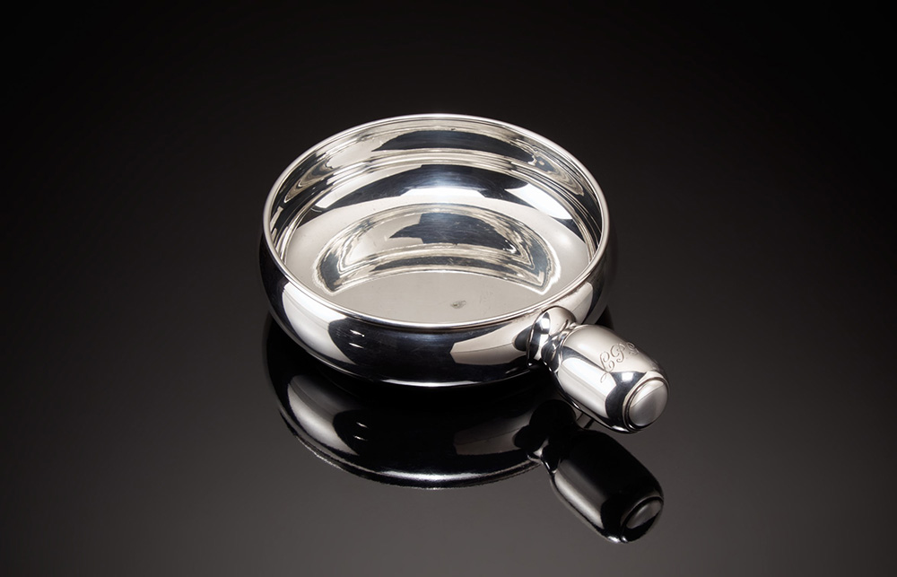 Paiola in argento circolare liscia. Argentiere Faraone. Italia, sec. XX (l. cm 17) (gr 140 ca.) (difetti) Italian silver vessel with handle. Silversmith Faraone. Italy, 20th century (defects)