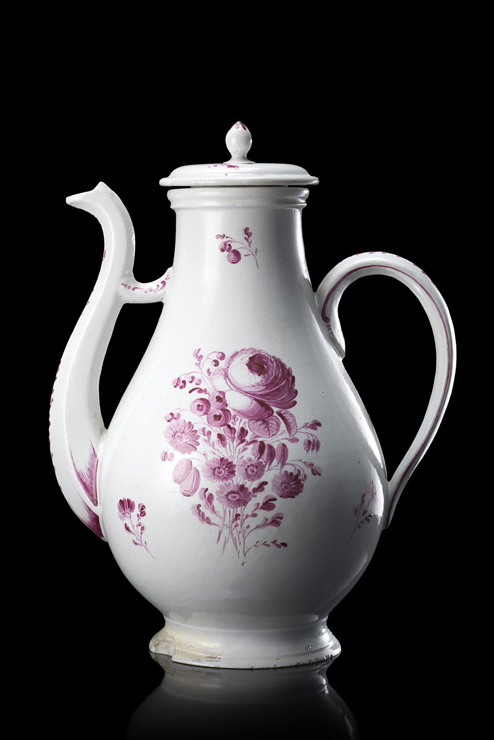 Caffettiera in porcellana con decoro floreale in monocromia porpora (h. cm 23) Doccia (?), manifattura Ginori (?), sec. XVIII / XIX (rotture al piede) Porcelain coffee pot. Doccia (?), Ginori manufactory (?), 18th/19th century (chipping)