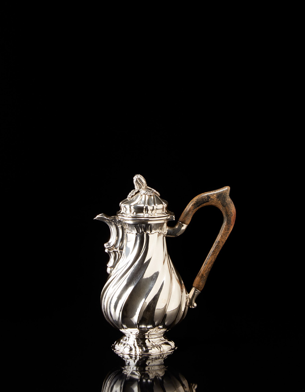 Caffettiera in argento con corpo piriforme a fesonature e costolature tortili...