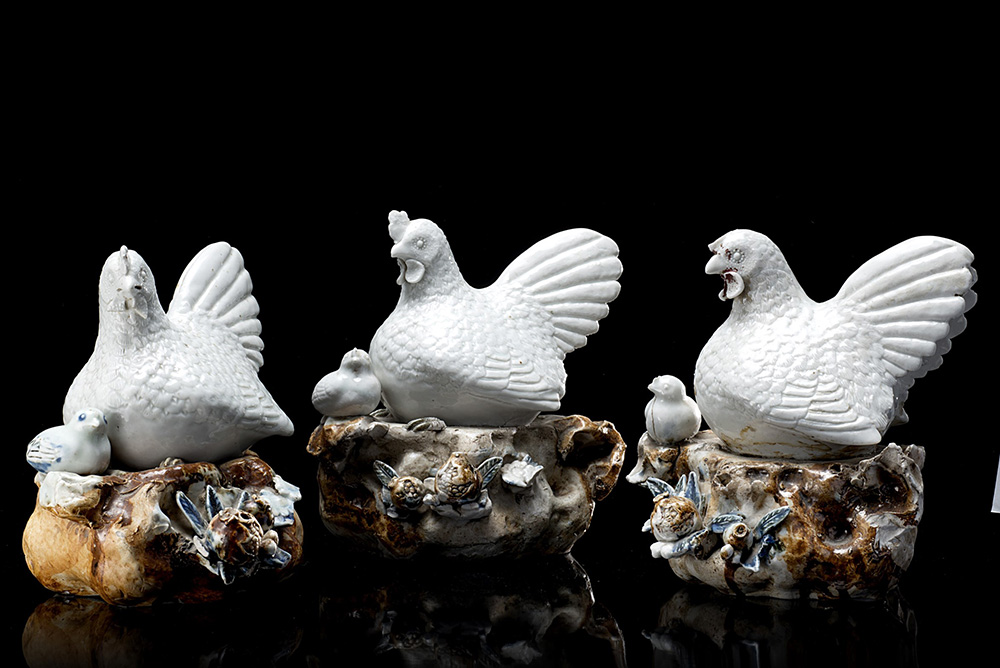 Tre galline in porcellana con pulcino su base policroma con fiori e frutti Cina, sec. XX Three porcelain models of hens and chicks China, 20th century (h. 21 cm.)