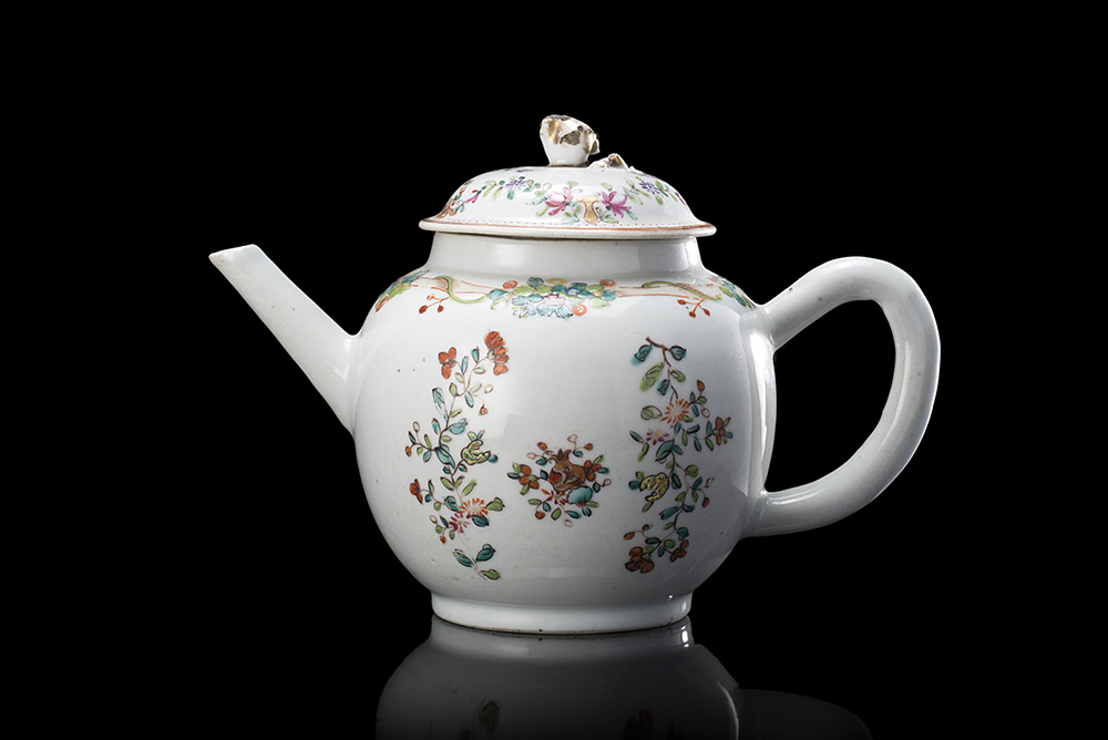 Teiera con coperchio con decorazione policroma a fiori e frutti (restauro al pomolo) Cina, sec. XVIII A porcelain teapot and cover with polychrome decoration of fruits and flowers (small restorations) China, 18th century (h. 17 cm.)