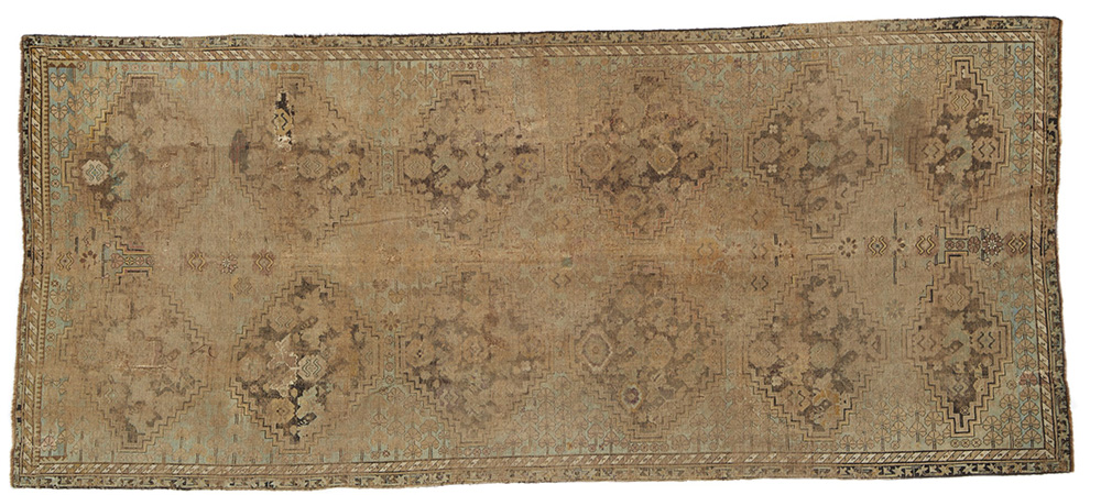 Tappeto Hila Caucaso, inizio del sec. XIX, disegno a medaglioni romboidali ipetuti nei toni azzurro, beige e marrone (cm 365x160) (gravi difetti) Early 19th-century Hila Caucasian carpet (major defects)