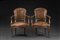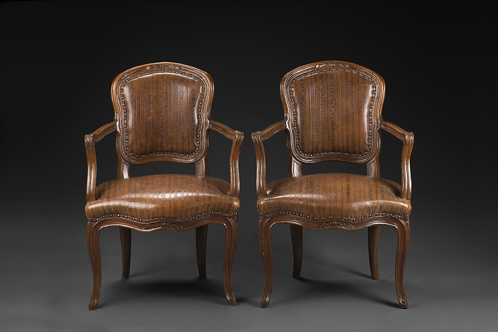 Coppia di poltrone in legno intagliato, schienale e gambe mosse, braccioli con finale a ricciolo, ricoperte in cuoio operato. Sec. XVIII A pair of 18th-century carved wood armchairs