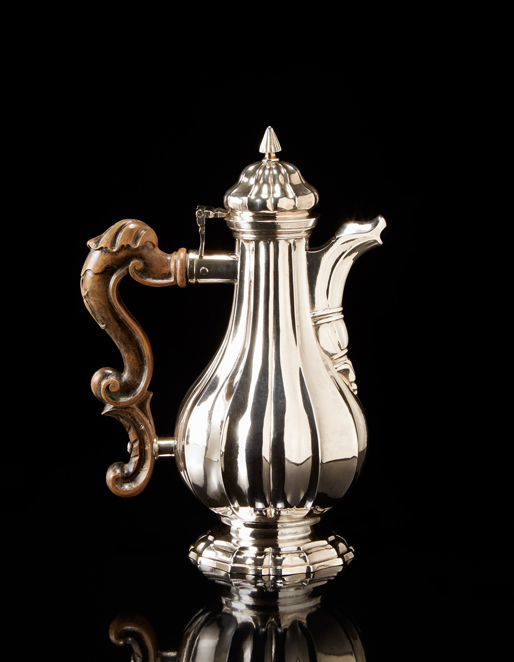 Caffettiera in argento con piede mistilineo e gradinato, corpo piriforme a baccellature e costolature verticali che continuano sul coperchio a cupola bombata; beccuccio sagomato e modanato, presa a puntale. Manico a doppia voluta in legno intagliato. Saggiatore MG. Venezia, 1762-1776 (h. cm 26) (gr lordi 730 ca.) (difetti) Silver coffee pot. Venice, 1762-1776 (defects)