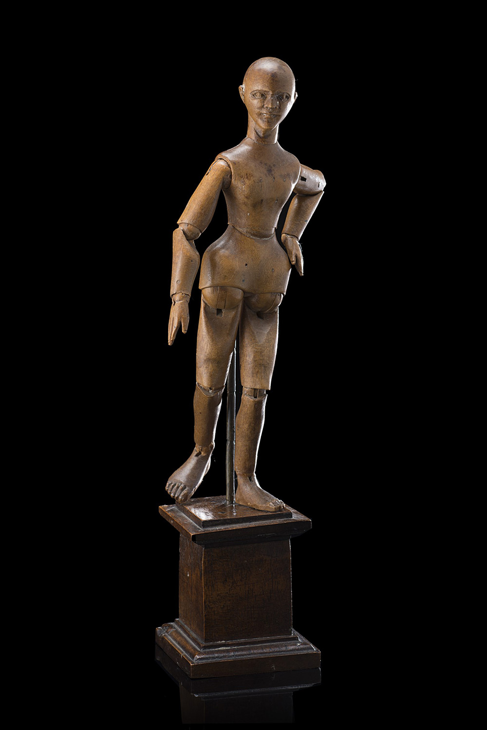Manichino d'artista in legno, testa e arti snodabili e scolpiti, su base a plinto, fine sec. XIX (h. tot. cm 30) (minimi difetti) Late 19th-century wooden artist's mannequin (minor defects)