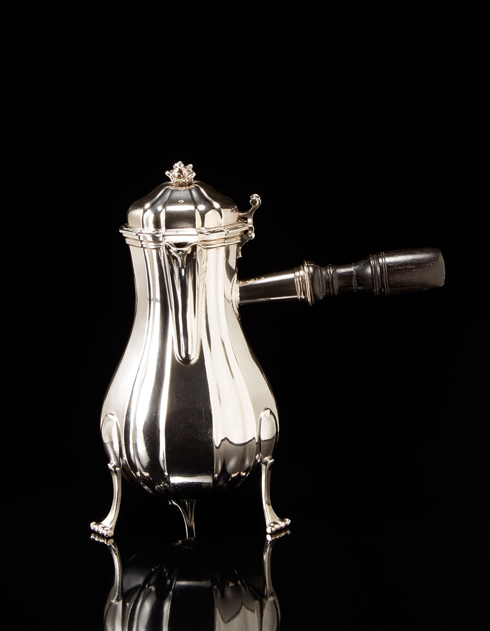 Versatoio tripode in argento con corpo piriforme, coperchio bombato e beccuccio, sfaccettati e baccellati; piedini a ricciolo e presa a bocciolo. Manico radiale in legno ebanizzato. Argentiere PP. Lille, met‡ sec. XVIII (h. cm 23,5) (gr lordi 790 ca.) (difetti) Silver coffee pot. Silversmith PP. Lille, mid 18th century (defects)