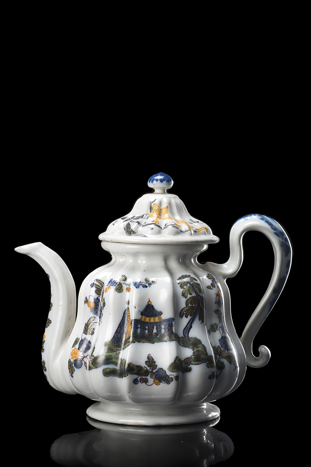 Teiera in maiolica di forma costolata con decoro policromo di gusto orientale con pagoda e piramide su radice ad arco. Nove, Bassano, Antonibon, sec. XVIII (h. cm 18) Provenienza: Nella Longari Antiquariato Milano Majolica teapot. Nove, Bassano, Antonibon manufactory, 18th century