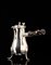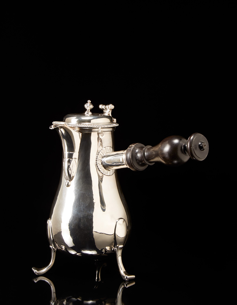 Versatoio tripode in argento con corpo piriforme liscio, coperchio bombato con tesa godronata, beccuccio con sportellino parzialmente decorato a foglie lanceolate; presa a trottola. Manico radiale in legno tornito ed ebanizzato. Argentiere Balthazar LefËvre. Parigi, 1728 (h. cm 22) (gr lordi 790 ca.) (difetti) Silver coffee pot. Silversmith Balthazar LefËvre. Paris, 1728 (defects)