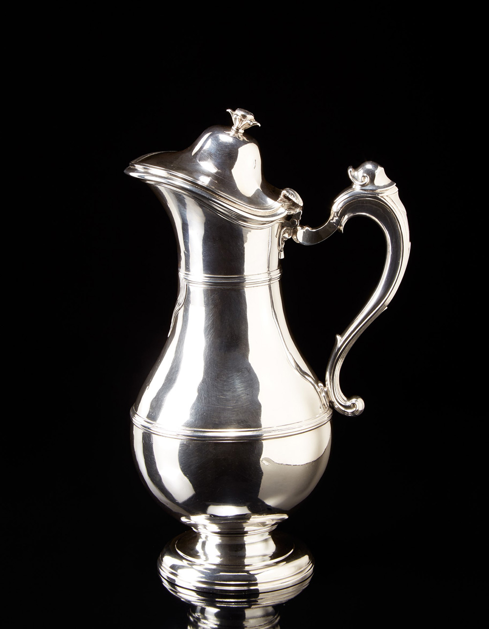 Versatoio in argento con piede circolare bombato e corpo a balaustro, lisci e modanati. Orlo e coperchio a cupola sagomati. Presa a fiore e poggiadito fogliato. Manico in argento a voluta con cresta ad elmo. Marsiglia, 1748 (h. cm 27) (gr lordi 880 ca.) (difetti) Silver coffee pot. Marseilles, 1748 (defects)