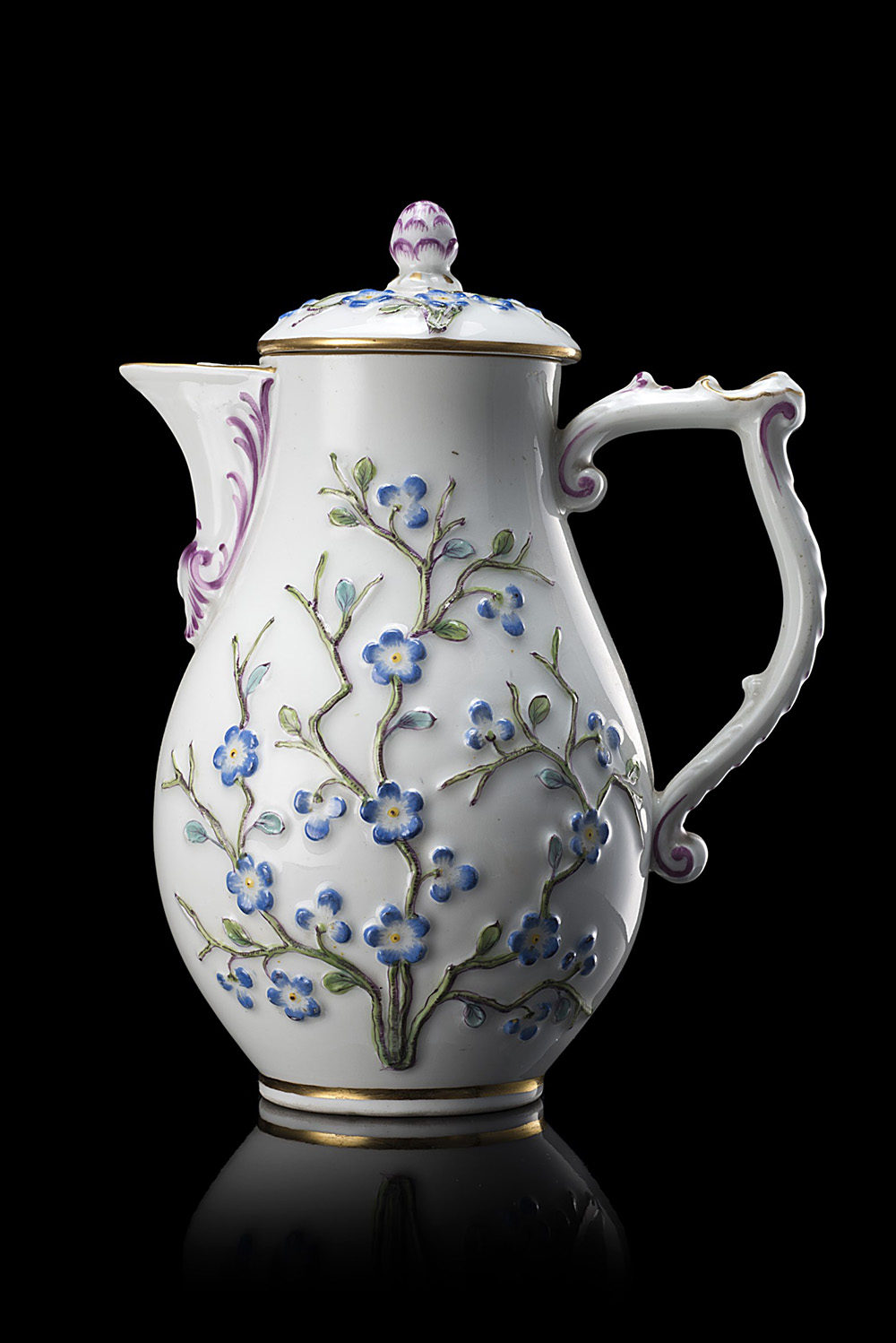 Caffettiera in porcellana policroma con motivo decorativo a rilievo con fiori di pruno. Profili in oro. Manico ad osso (h. cm 16) Marca di fabbrica. Berlino, sec. XVIII Porcelain coffee pot. Berlin, 18th century