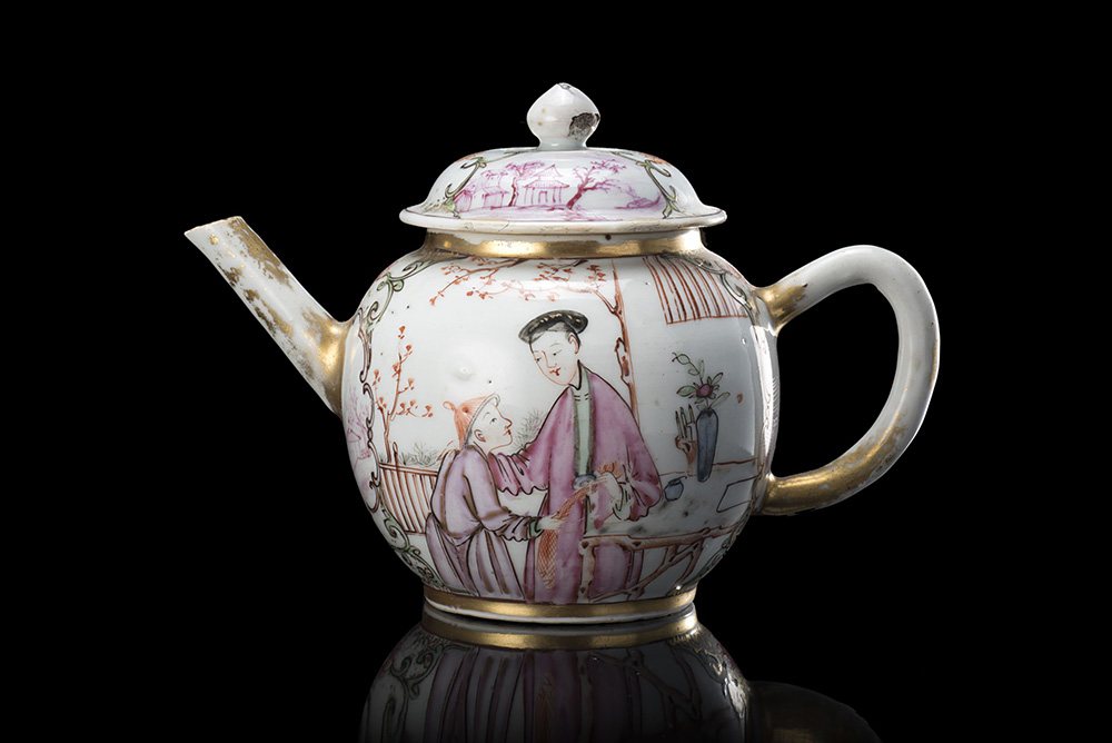 Piccola teiera con coperchio in porcellana Famiglia Rosa e doratura (difetti al coperchio) Cina, sec. XVIII A small Famille Rose teapot and cover with gilt decoration (losses to the cover) China, 18th century (h. 15 cm.)