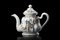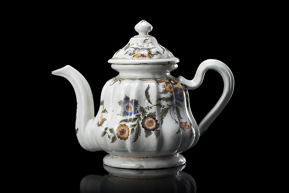 Teiera in maiolica con corpo piriforme costolato, lungo beccuccio ed alto manico a voluta. Decorazione ëa blanserí (h. cm 16) Nove, Bassano, Antonibon, sec. XVIII (sbeccatura al piede e mancanza al manico) Majolica teapot. Nove, Bassano, Antonibon manufactory, 18th century (chipping and losses)