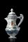 Caffettiera sagomata e costolata in maiolica con decoro ëal garofanoí. Manico a ricca voluta rocaille. Profili in blu (h. cm 27) Sec. XX (rottura al bordo del coperchio e pomolo riattaccato)