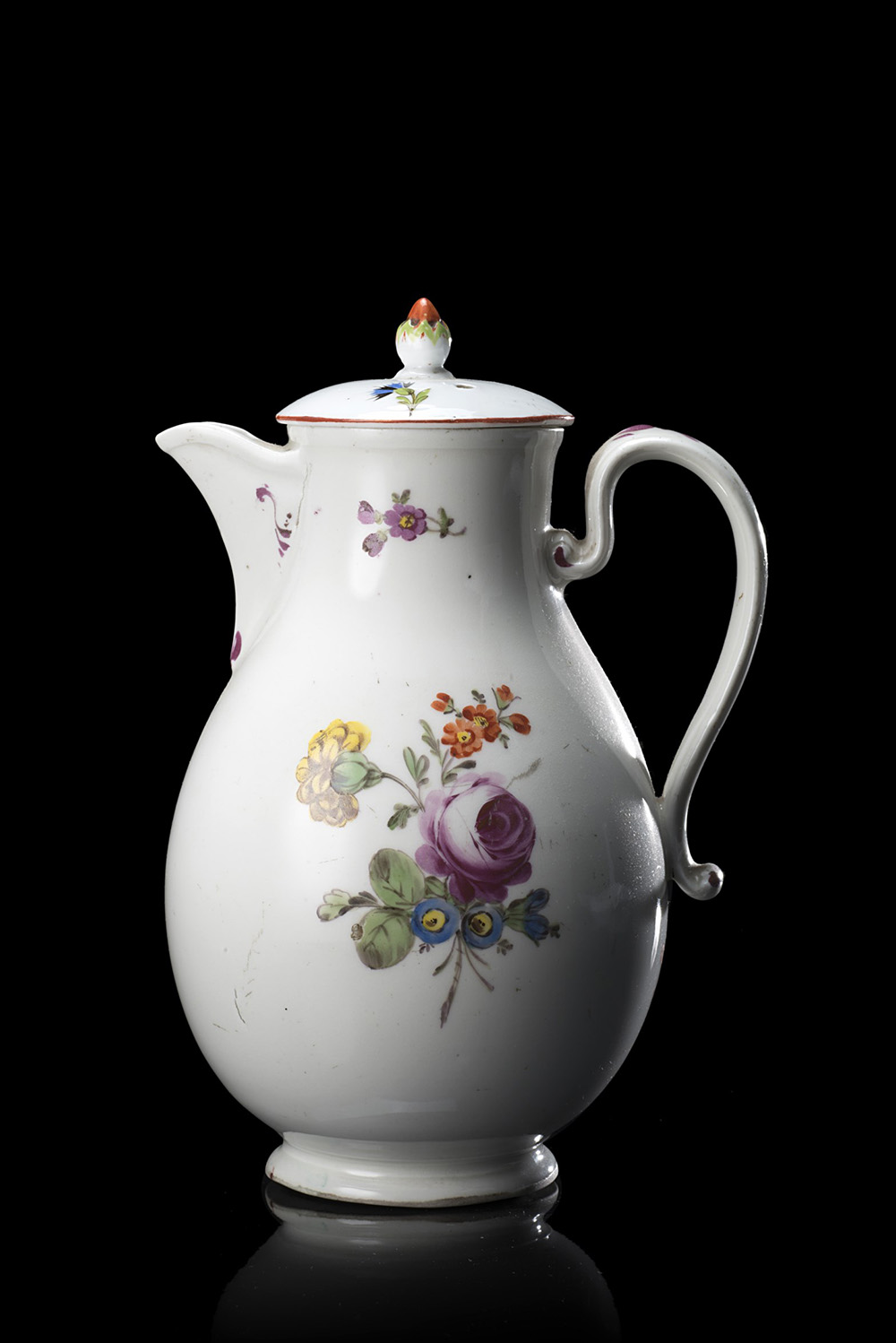 Caffettiera in porcellana decorata a bouquet di fiori, profili in rosso porpora. Manico a voluta. Coperchio piatto con presa a ghianda non pertinente (h. cm 20) Doccia, manifattura Ginori, sec. XVIII/XIX (usure) Porcelain coffee pot. Doccia, Ginori manufactory, 18th/19th century (cover of a later date, wear)