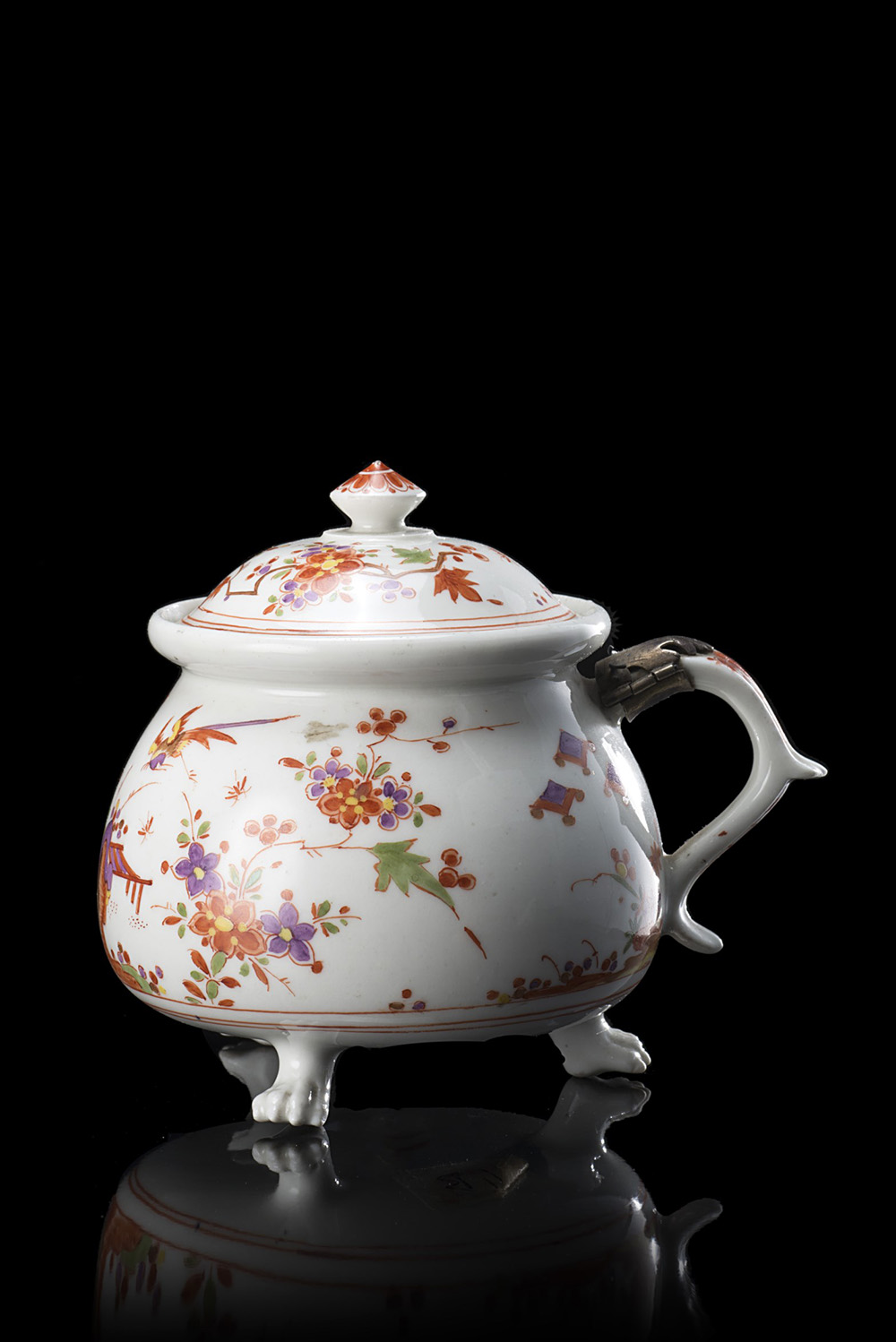 Pot ‡ crËme in porcellana su tre piedi leonini , ansa a ricciolo con finitura in argento. Decorazione policroma a fiori coreani (h. cm 10) Modello tipico di Meissen. Senza marca di fabbrica. Sec. XVIII (lievi difetti) Porcelain tripod cream-pot. 18th century (minor defects)