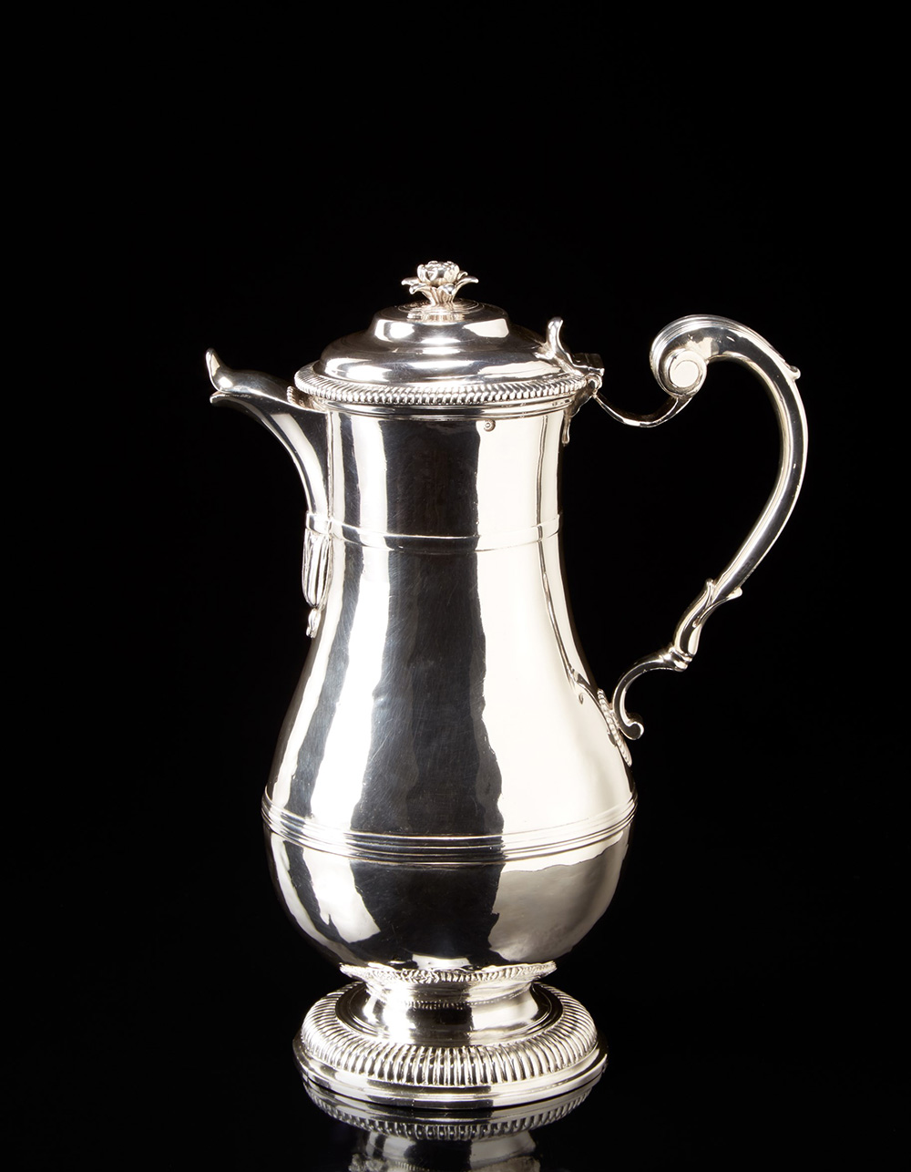 Versatoio in argento con corpo a balaustro, piede bombato e coperchio a cupola spianata, decorati a godronature baccellate e cinture modanate. Becuccio sagomato con estremit‡ inferiore fogliata; presa a fiore. Manico in argento ad ansa. Argentiere Igonet Sebastien. Parigi, 1725 (h. cm 25) (gr 820 ca.) (difetti) Silver coffee pot. Silversmith Igonet Sebastien. Paris, 1725 (defects)