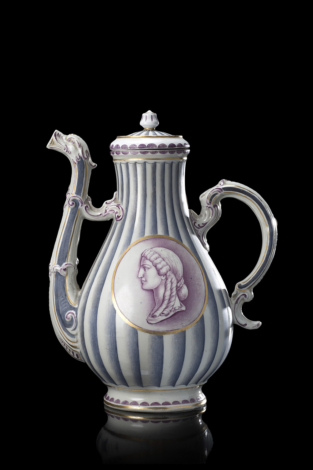 Caffettiera in porcellana a decoro neoclassico con due medaglioni bordati in oro con ritratti di profilo in color porpora ispirati a cammei antichi. Fondo a grosse righe verticali in bianco e azzurro. Versatoio zoomorfo. Profili in oro (h. cm 20) Marca di fabbrica : piccola stella in oro e lettere CB incusse. Ginori, sec. XVIII, Coperchio non pertinente