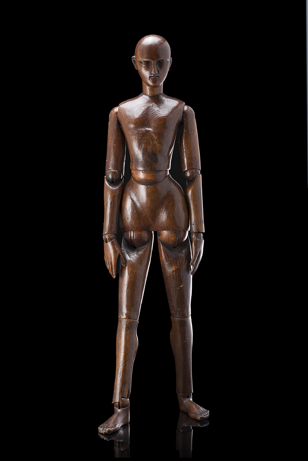 Manichino d'artista in legno, testa e arti snodabili e scolpiti, fine sec. XIX (h. cm 47) Wooden artist's mannequin. Late 19th century