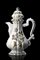 Caffettiera piriforme costolata in maiolica decorata a gran fuoco a rose con spine. Becco versatore sagomato e ansa a doppia voluta e coperchio ëalla persianaí. Stemma araldico policromo dipinto sotto il beccuccio (h. cm 25,5) Nove, Bassano, Antonibon, sec. XVIII (restauro al coperchio e difetti di cottura dello smalto) Majolica coffee pot. Nove, Bassano, Antonibon manufactory, 18th century (restorations and defects to enamel)
