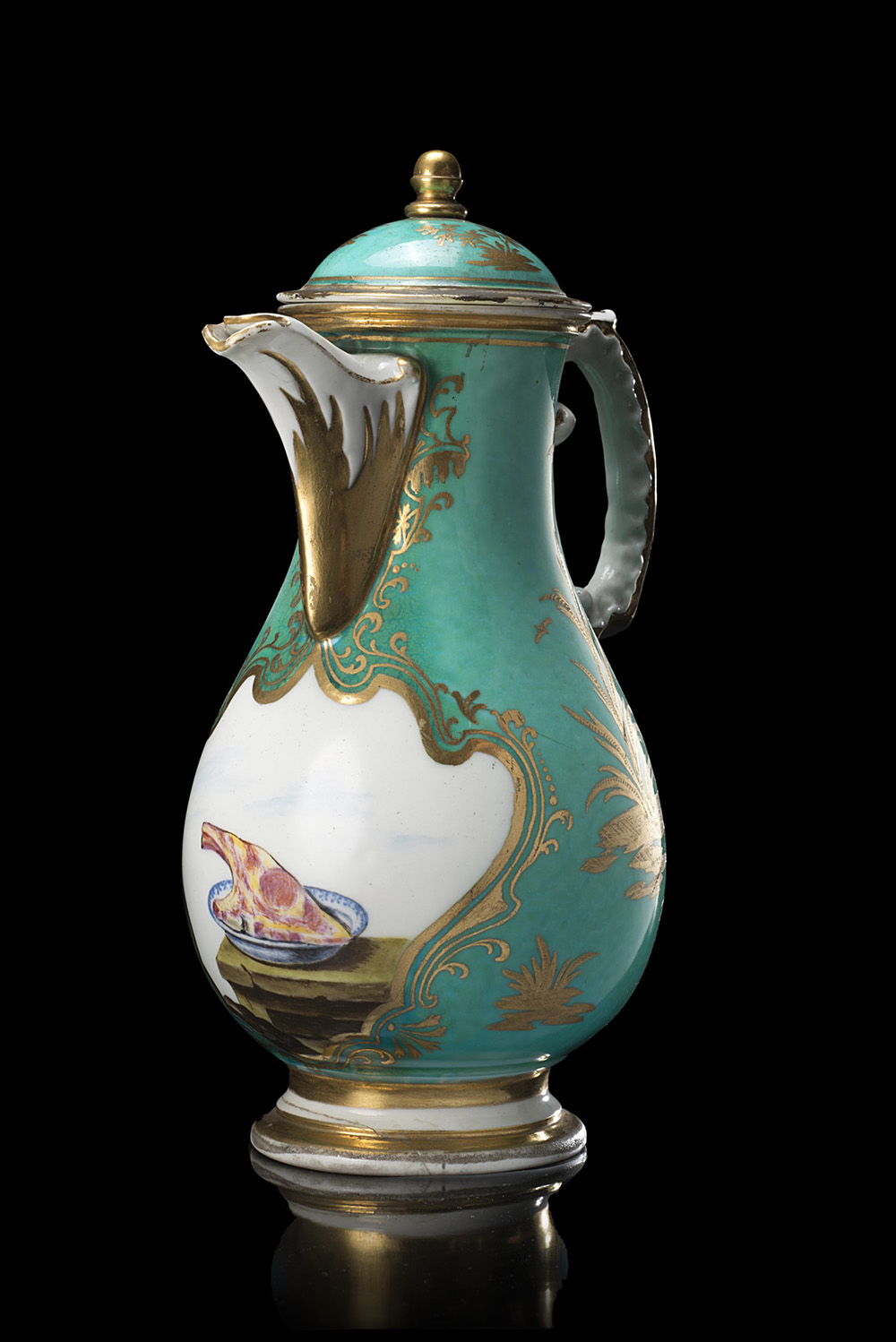 Caffettiera a corpo piriforme in porcellana a fondo verde. Profili dorati e fiori sparsi in oro. Manico a voluta. Al centro cartella rocaille profilata in oro con dipinto trancio di carne (h. cm 24,5) Marca di fabbrica giglio blu. Napoli, Capodimonte, sec. XX (restauri, usure e pomolo del coperchio riattaccato)