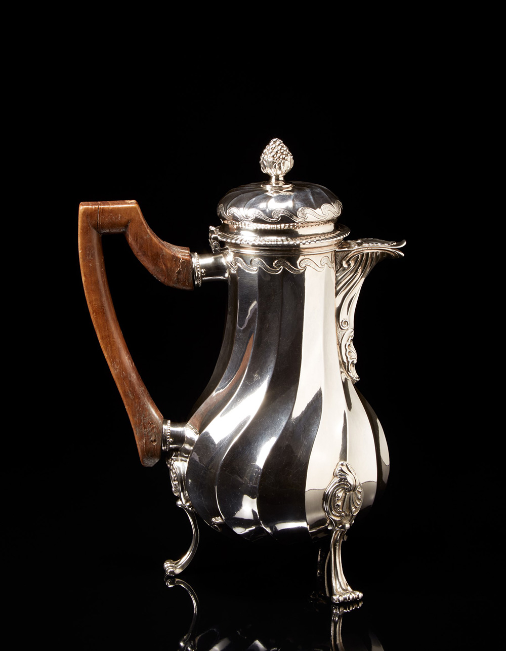 Cioccolatiera tripode in argento con corpo piriforme a nervature tortili e cintura di onde vitruviane ripetute sul coperchio bombato con tesa godronata a baccelli. Beccuccio sagomato e scanalato e piedini a ricciolo con attacchi a 'pelacette'; presa a pigna con innesto a vite. Manico ad arpa in legno. Zecca di Lille. Comunit‡ di Valenciennes, fine sec. XVIII (h. cm 29) (gr lordi 1000 ca.) (difetti) Silver chocolate pot. Valenciennes, late 18th century (defects)