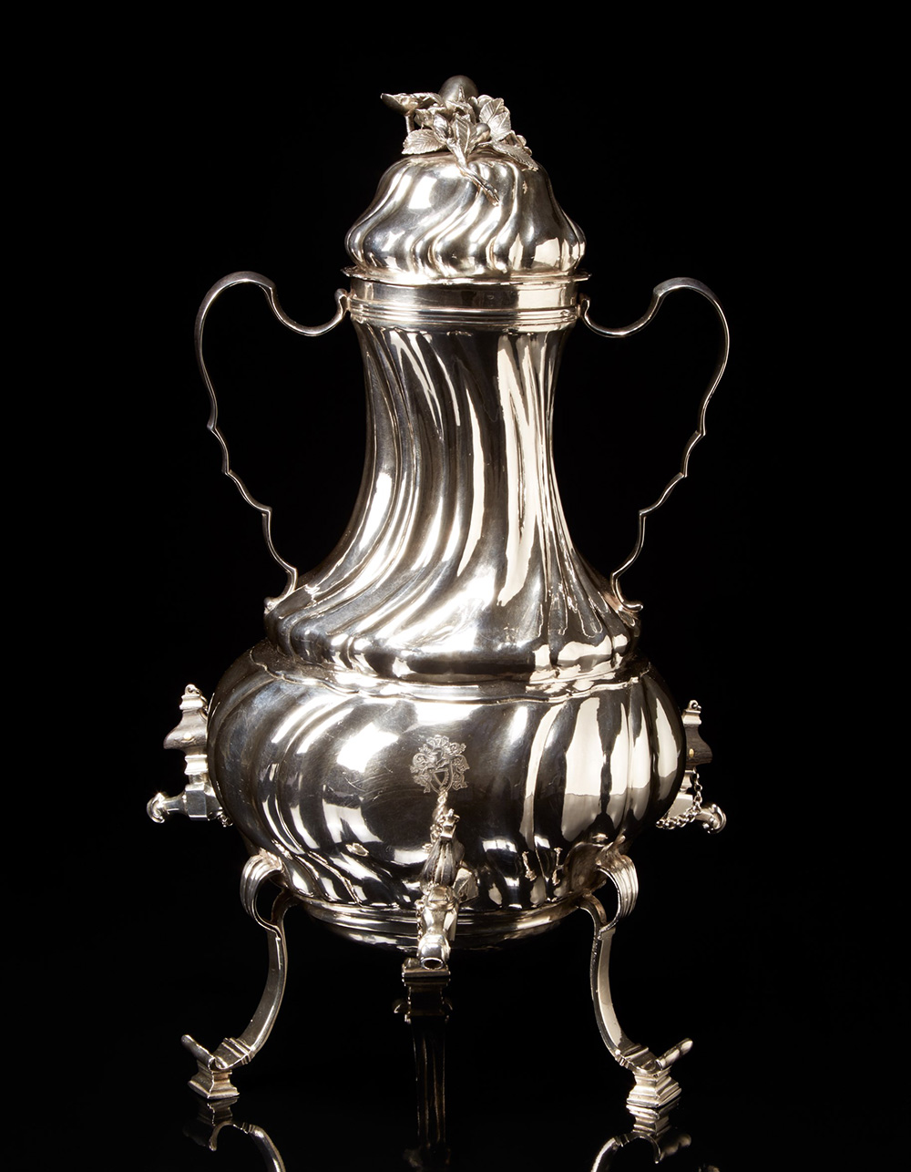Samovar tripode in argento con corpo a balaustro gradinato e modanato con fesonature tortili che continuano sul coperchio a cupola bombata, cimatura a fiori. Stemma inciso. Piedi a voluta su plinto e tre rubinetti con prese in legno ebanizzato. Due manici ad ansa sagomata. Argentiere Johann Georg Klosse. Augsburg, 1747-1749 (h. cm 39) (gr 1370 ca.) (difetti) Silver samovar. Silversmith Johann Georg Klosse. Augsburg, 1747-1749 (defects)