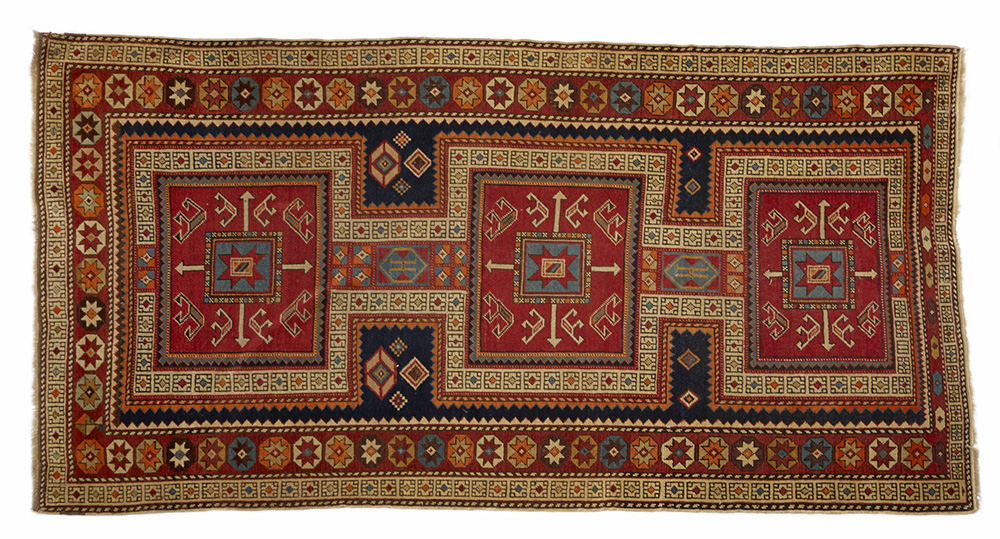 Tappeto Daghenstan Caucaso, fine del sec. XIX, disegno a tre medaglioni quadrati e dorato con motivi geometrici policromi (cm 200x107) (difetti) Late 19th-century Daghenstan Caucasian carpet (defects)