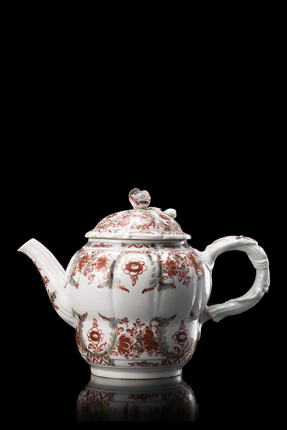 Teiera in porcellana di forma sagomata e costolata e decoro a fiori di gusto orientale in rosso entro fronde in grigio rialzate in oro. Versatore zoomorfo tipico delle teiere prodotte dalla manifattura Cozzi (h. cm 15) Etichetta cartacea di Schubert Antichit‡. Marca di fabbrica: ancora rossa. Venezia, Cozzi, sec. XVIII (piccoli restauri al coperchio e lievi sbeccature)