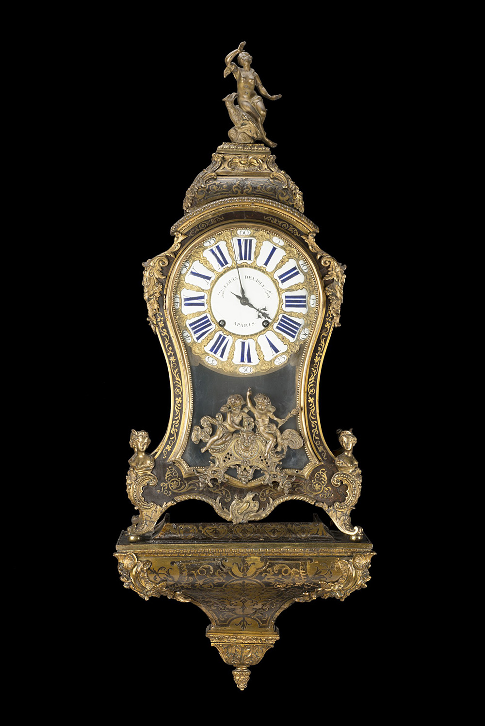 LUISE DELISLE A PARIS Orologio cartel con mensola in legno, tartaruga e ottone Epoca sec. XVII Quadrante e movimento firmato Quadrante a venticinque pezzi in smalto con numeri arabi e romani montato su bronzo dorato e cesellato Movimento a carica settimanale con suoneria delle ore e delle mezze con partitura, scappamento a verga originale (h cm 124 circa) (mancante di sportello, difetti e mancanze) Cartel clock with wood, tortoiseshell and brass bracket, 17th century (losses and defects)