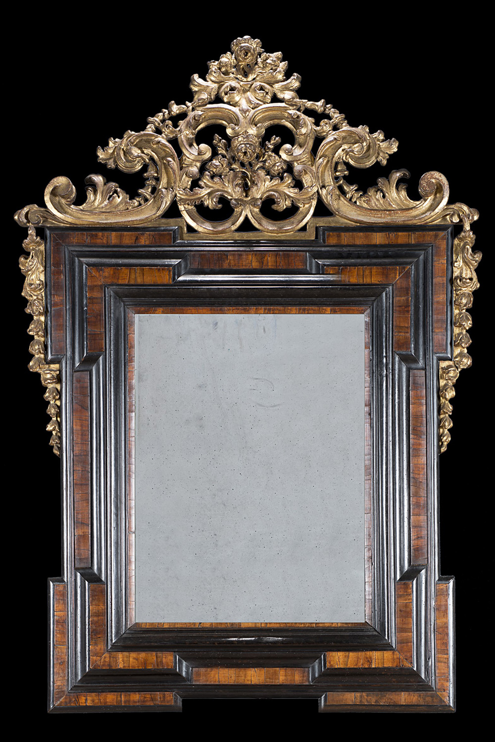 Specchiera con cornice sagomata, lastronata ed ebanizzata. Cimasa intagliata e dorata a fiori e volute ; fregi laterali a motivi fogliati. Veneto, inizio sec. XVIII (cm 160x95) 18th-century Venetian ebonised wood mirror