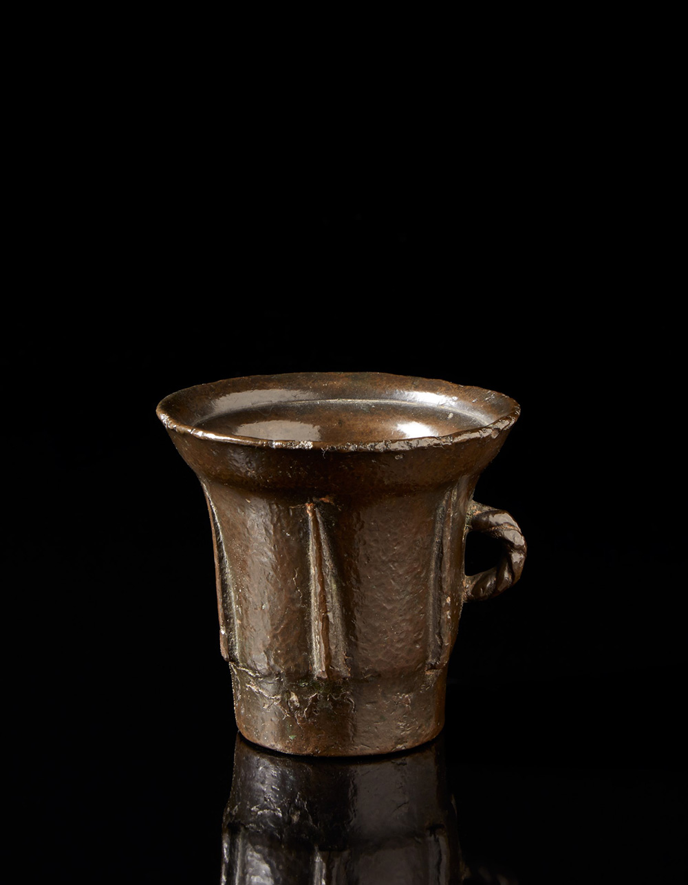 Mortaio in bronzo ad un'ansa intrecciata, corpo decorato a costolature. Italia centrale, sec. XV (cm 10) (difetti) Central Italy, 15th-century bronze mortar (defects)