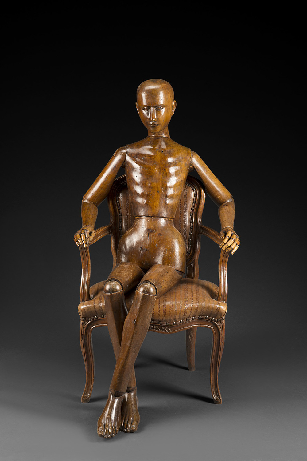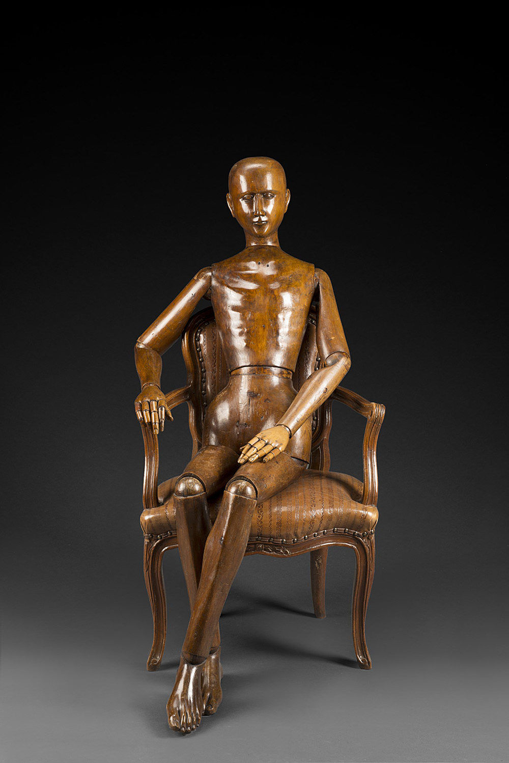 Manichino d'artista ad altezza naturale in legno, testa epiedi scolpiti, dita snodabili. Fine sec. XIX (h. cm 162) Late 19th-century wooden artist's mannequin