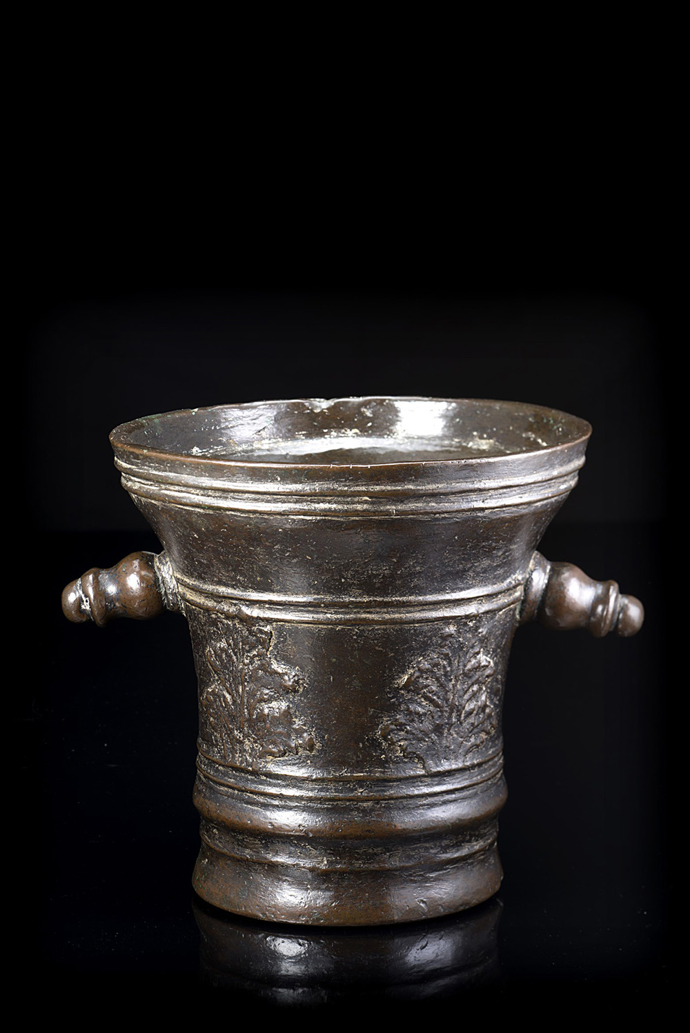 Mortaio biansato in bronzo con anse tornite. La fascia centrale con foglie,...