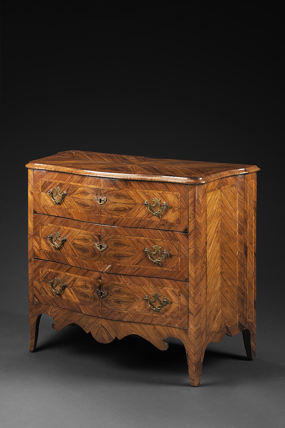 ComÚ a tre cassetti di forma mossa sul fronte e sui fianchi , lastronato in...