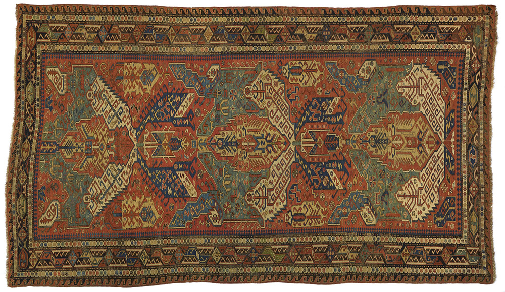 Tappeto Sumak, Caucaso sec XIX. Disgno a draghi policromi su fondo mattone...