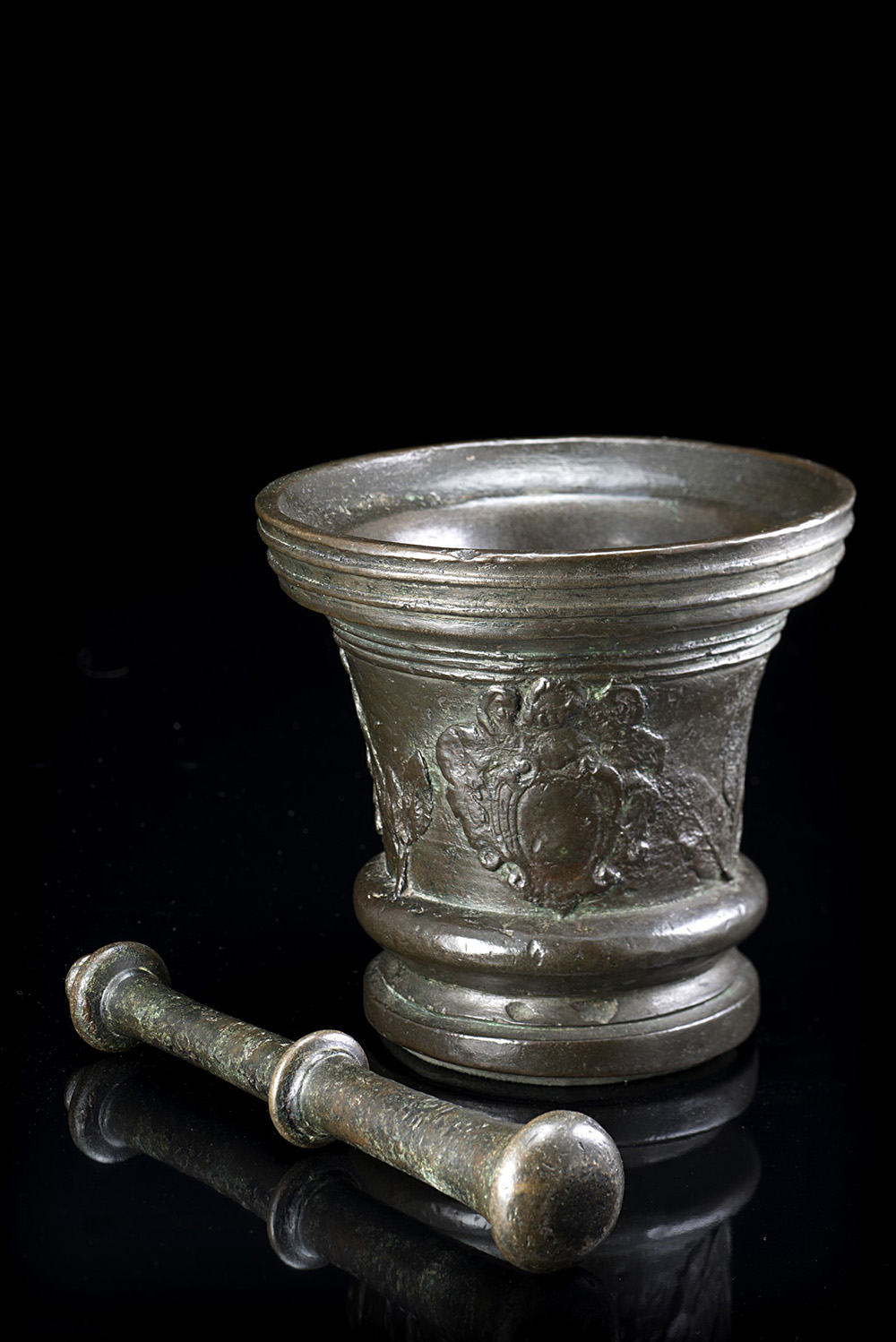 Mortaio in bronzo con pestello, Italia settentrionale,sec. XVII. La fascia con due mascheroni intervallati da foglie centrata da stemma (cm 15) (difetti) Bronze mortar and pestle. Northern Italy, 17th century (defects)
