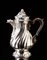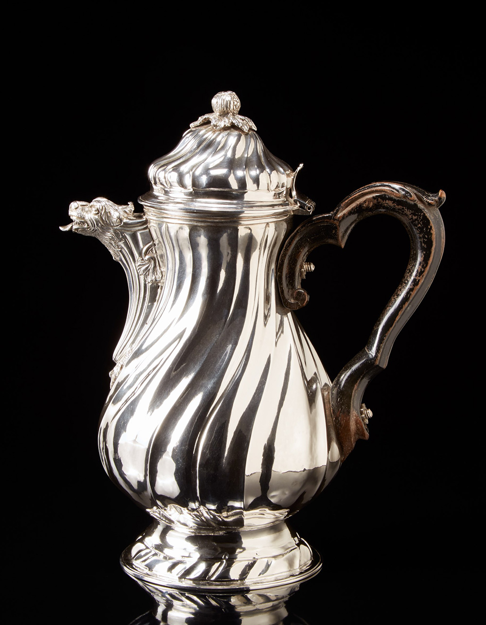 Caffettiera in argento con piede circolare sagomato e gradinato, corpo piriforme con nervature e fesonature tortili che continuano sul coperchio a cupola bombata; beccuccio zoomorfo con scanalatura e rilievi e fogliati, presa a frutto. Manico in legno ad ansa sagomata. Ducato di Milano, Bottega lombarda all'insegna della' Testa di moro', sec. XVIII (h. cm 29) (gr 980 ca.) (difetti) Silver coffee pot. Duchy of Milan, 18th century