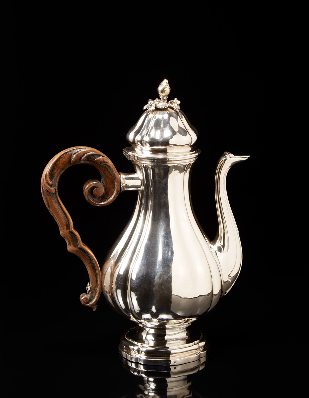 Caffettiera in argento con piede circolare sagomato e gradinato, corpo a balaustro con baccellature verticali che continuano sul coperchio a cupola bombata, versatoio a collo di cigno scanalato con sportellino e presa a frutto. Manico ad ansa in legno intagliato. Stato Pontificio, prima met‡ sec. XIX (h. cm 30) (gr lordi 920 ca.) (difetti) Silver coffee pot. Papal States, early 19th century (defects)