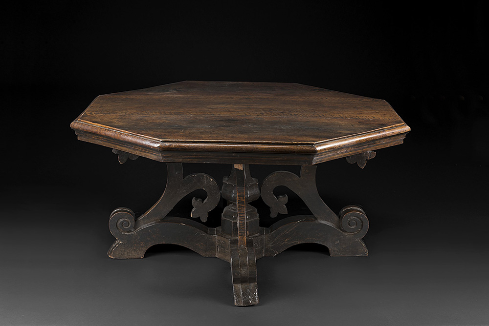 Grande tavolo ottagonale in noce, gamba centrale a colonna, girali sagomate poggianti su mensole sagomate. Inizio sec. XVII (cm 150x73x150)(restauri) Large 17th-century Lombard walnut table (restorations)