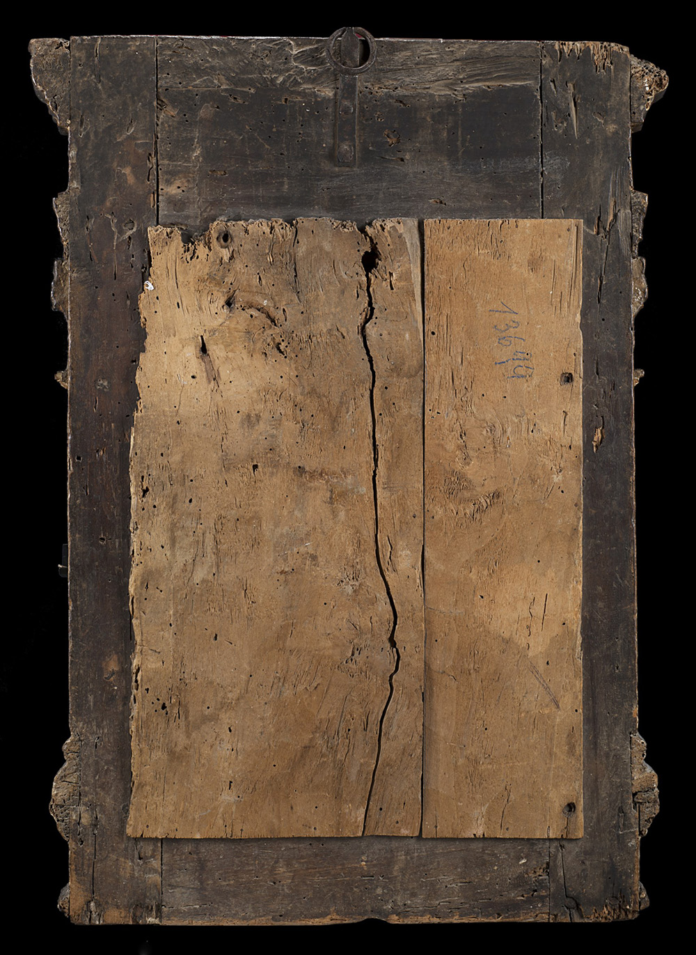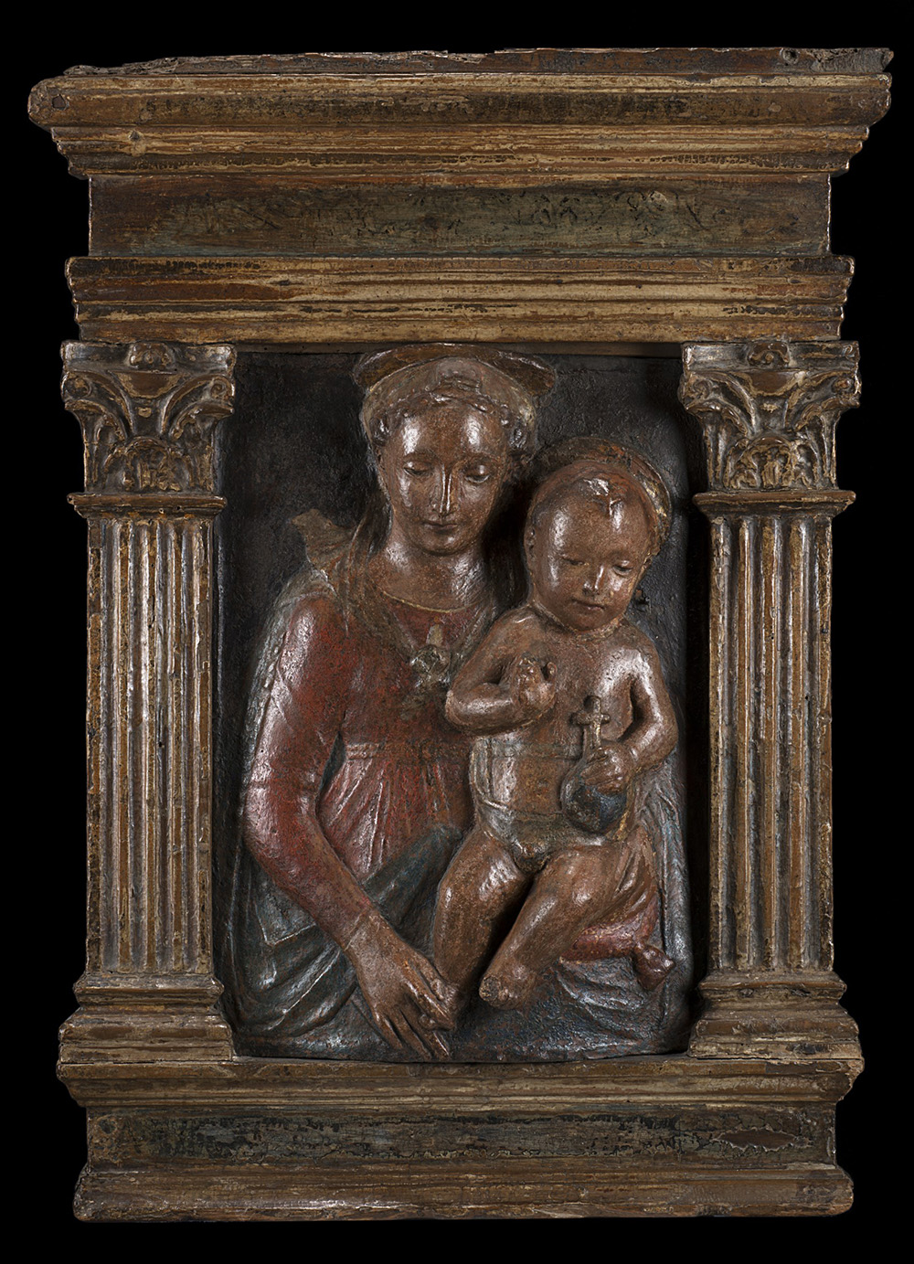 Mino da Fiesole (Papiniano, Arezzo, 1429 - Firenze 1484) e bottega. Madonna col Bambino benedicente, del tipo detto ëMadonna Morganí, 1470/75 ca. Bassorilievo in terracotta dipinta (cm 46x33,5) Tabernacolo architettonico in legno dipinto (cm 78x59x9) (minimi difetti) Mino da Fiesole (Papiniano, Arezzo, 1429 - Firenze 1484) and workshop. "The Virgin and Child", 1470/75 ca. Polychrome-painted terracotta bas-relief. Framed (minor defects)