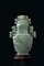 Vaso con coperchio in pietra dura verde con striature, dalla forma arcaica, decorato a rilievo con motivo taotie, con base in legno Cina, tarda dinastia Qing (1644-1911) A hard-stone vase and cover, of archastic form, decorated in high relief with taotie masks, the stone of a green tone with inclusions, with wood base China, late Qing dynasty (1644-1911) (h. 18,5 cm.)